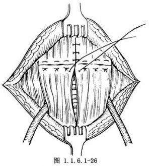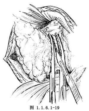 甲状腺叶切除后,颈前肌层断端缝合并留置引流管